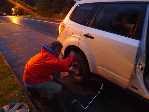 Wait a minute. Let me share my version of the story. After a few hours of hiking in heavy rain, unloading all the stuff from the trunk and changing a flat tire in a dark, drizzle evening, finding out that the valve of the spare tire is damaged and fixing it somehow, what could be the worst thing to figure out? Probably that while you did all this, your lovely partner turned on the ignition key in order to have her seat heated. This turned on also the headlights, the portable cooler and a bunch of other lights inside the car. As a result, when I was finally done and almost frozen, the battery was completely drained. No problem, the push I had to do to start the car warmed me up. I love you, honey…