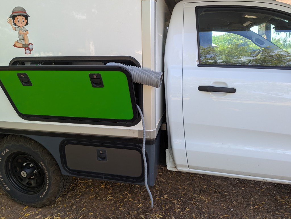 After quick research, I ordered a portable one. It arrived a few days later, and after spending a few hours at the local hardware store, borrowing some tools from the camping maintenance guy, and cutting and drilling holes in La Casita, I had the air conditioner stuck in the storage compartment, blowing nice cool air inside. The only problem was that the storage space door had to be opened for the warm air to escape. This Frankenstein solution worked for a few nights. Until the first rain…